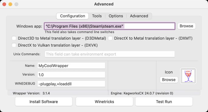Theoretically, Steam should "just work." Give it a test run before you close your wrapper app. If your wrapper stops working, open up your wrapper .app with "Show Package Contents" and open KegworksConfig.app to get access to the config menu again.