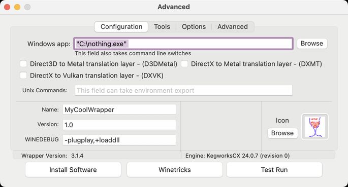 Whisky was recently pronounced dead [src]. This was inevitable. It wasn't really that good either. However, this leaves a void in the macOS gaming community of Wine GUIs that don't cost an arm and a leg.
